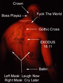 - 4. Вдоль живота – Надпись Thug Life (жизнь головореза, гангстера) и вместо буквы I нарисована пуля.